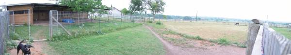 Red Top, named not for its red top but red sides, is the home of our original 10 outdoor runs. These runs are long-since gone, and the covered site is now the shady spot for this playgroup. The little racecar inside (blue, to your left) is just for fun. The cows in the background are our two largest pets. They are very good at keeping the dogs entertained and keeping the grass down, too!